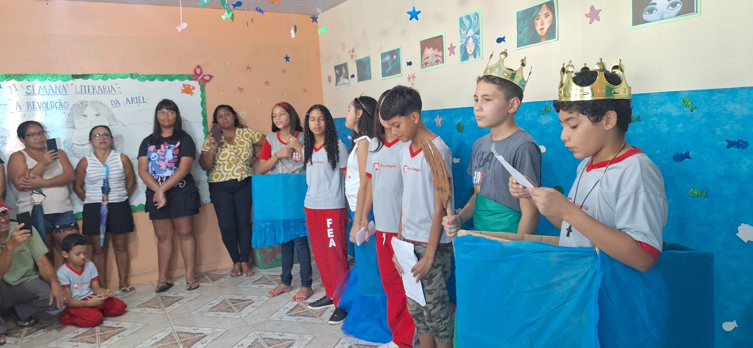 A leitura de A Revolução da Ariel gerou discussões sobre os finais tradicionais das princesas. Em seguida, os educandos criaram finais alternativos e organizaram a encenação da nova versão da Ariel, agora uma personagem protagonista da própria história, corajosa, decidida e dona de suas escolhas. Após a peça, os educandos promoveram a dinâmica Tesouros do Coração, em que os responsáveis escreveram mensagens afetivas em cartões com formatos do fundo do mar, reforçando o valor simbólico da experiência.