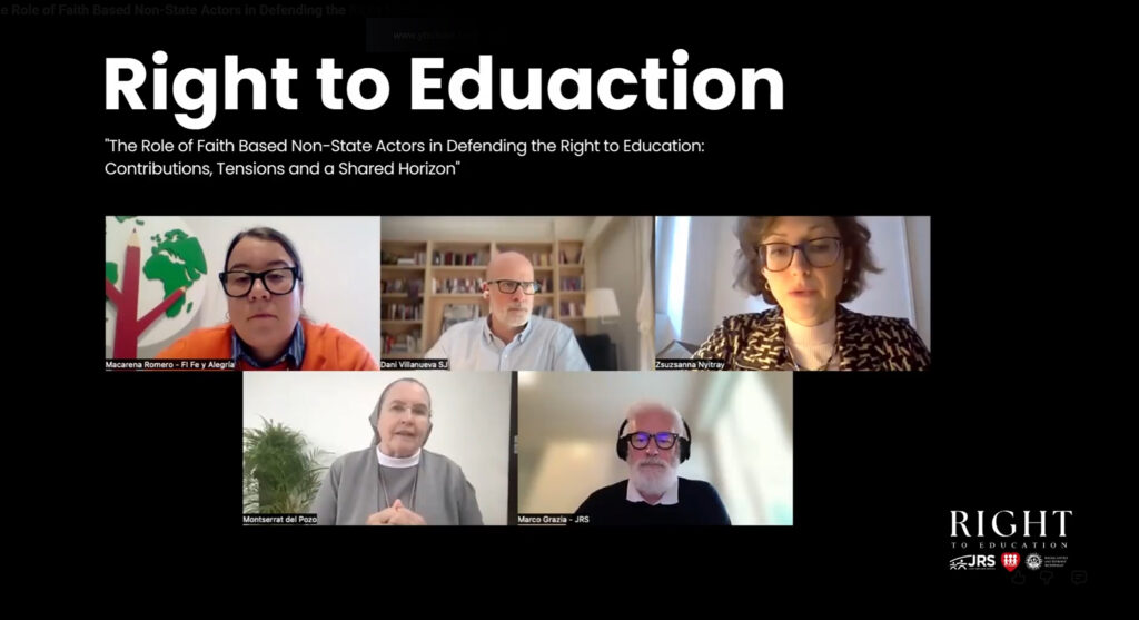 El diálogo contó con la participación de Macarena Romero, técnica de acción pública de la Federación de Fe y Alegría Internacional; Marco Grazia, director de Educación del Servicio Jesuita a Refugiados (JRS); Montse del Pozo, de Nazareth Global; y Zsuzsanna Nyitray, abogada especializada en derechos humanos. La conversación fue moderada por Dani Villanueva SJ, coordinador general de la Federación Internacional Fe y Alegría.
