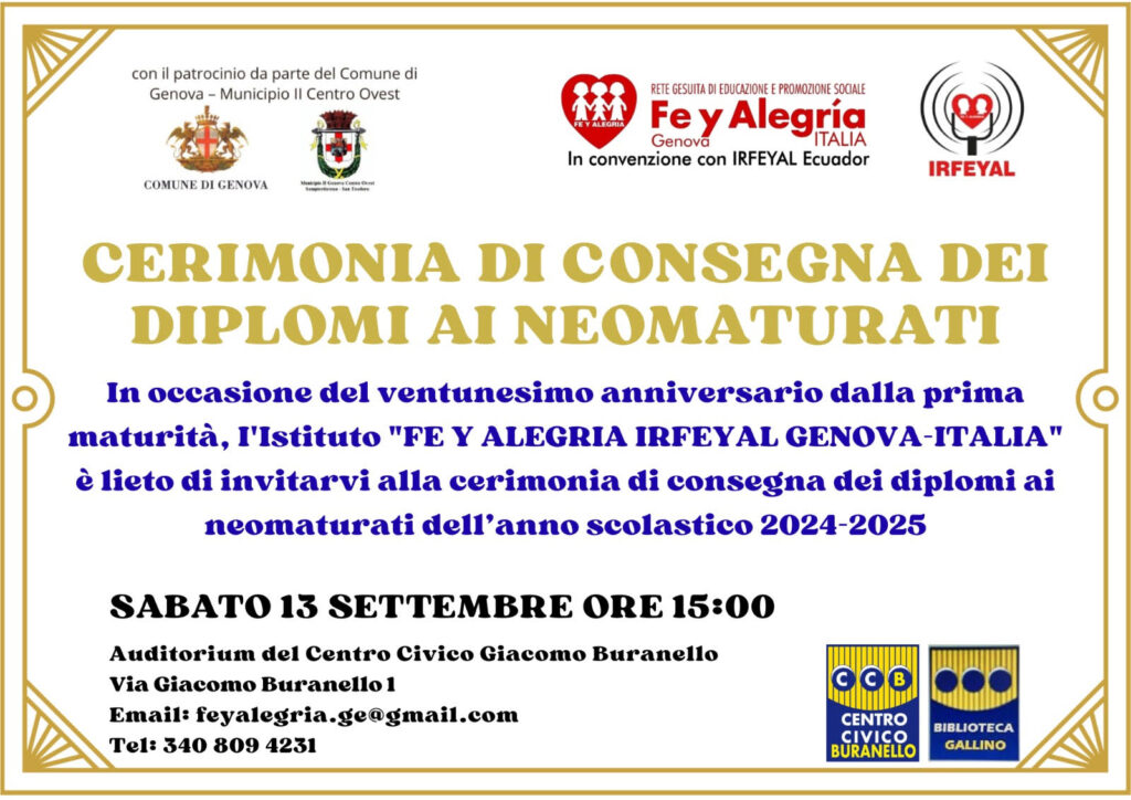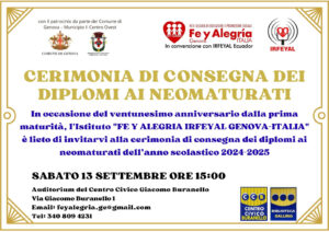 Genova, 15 settembre 2025 – Trentaotto giovani e adulti di origine latinoamericana hanno celebrato un risultato storico ricevendo il diploma di Bachiller de la República del Ecuador con Fe y Alegría IRFEYAL Genova, riconosciuto in Italia come diploma di scuola secondaria superiore. Un traguardo che apre nuove opportunità di studio universitario, lavoro e integrazione sociale per la comunità migrante.