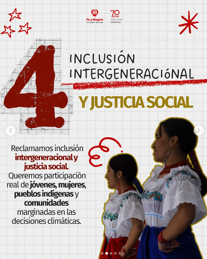 A una semana de la cumbre, Fe y Alegría reafirma su compromiso intergeneracional con los derechos, la justicia social y el cuidado de la Casa Común, sumándose al llamado global: “No hay justicia climática sin justicia social.”