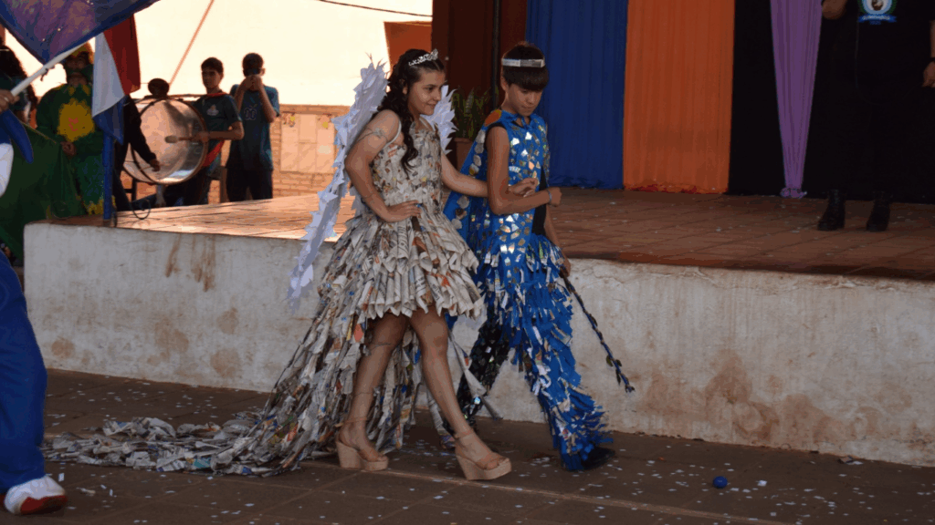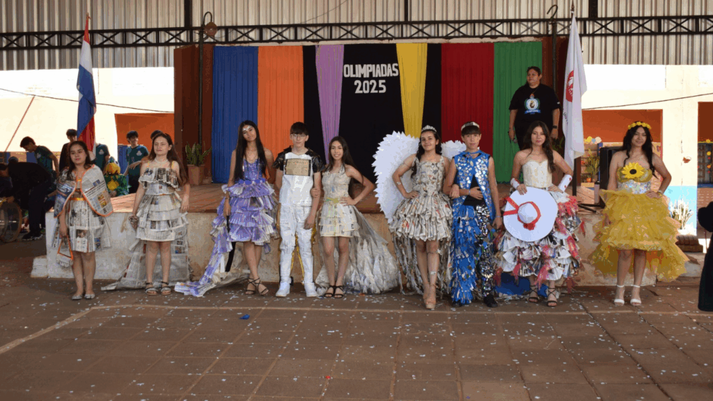 Con materiales como hojas de papel diario, bolsas de plástico, cartones, etc., los y las estudiantes del nivel medio confeccionaron elegantes trajes, demostrando su talento y brindando un mensaje sobre la importancia del cuidado de la casa común.