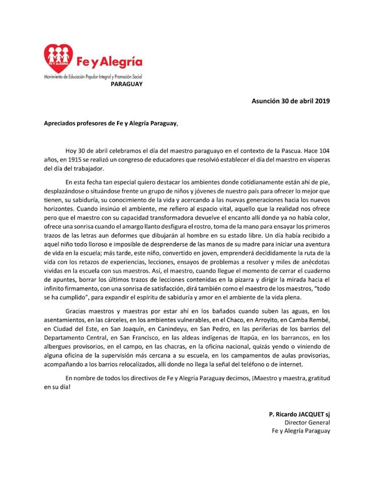 Saludo y reconocimiento de parte del Director Nacional de Fe y Alegría, el Padre Ricardo Jacquet SJ por su loable labor a todos los docentes quienes se desempeñan y cumplen esta función en los distintos Centros Educativos llevando consigo la bandera de Fe y Alegría y poder cumplir así con los objetivos y por ese medio lograr llegar a una calidad de vida buena y por ende la construcción de un mundo mejor a través de la Educación.