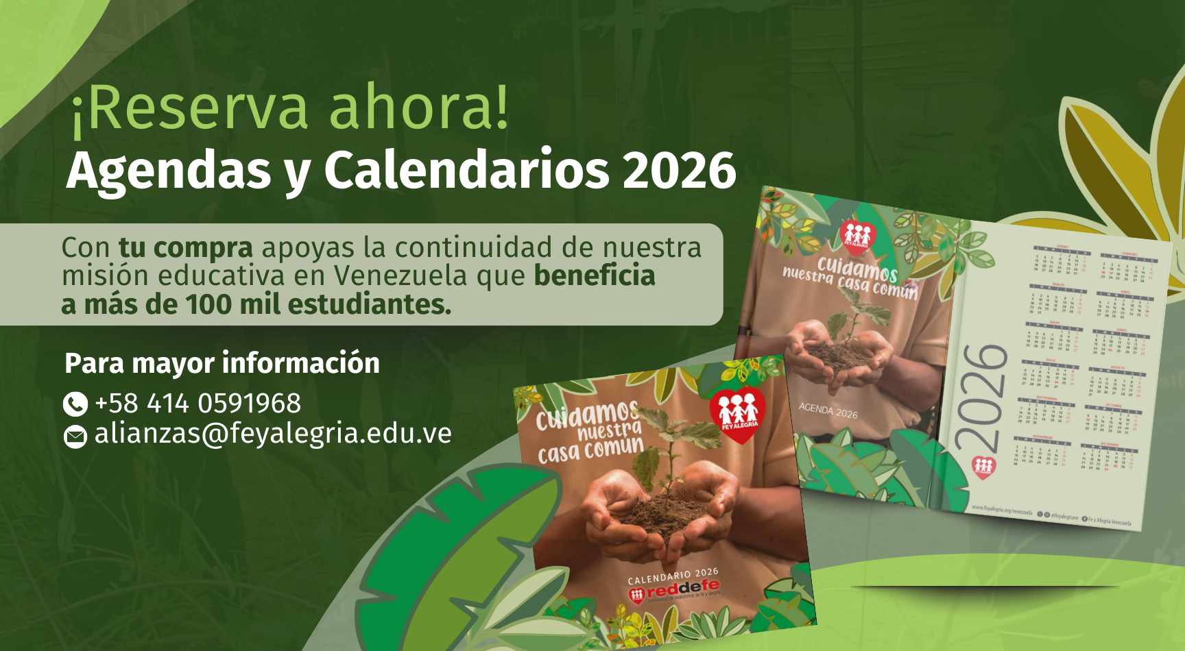 Al adquirir la Agenda y el Calendario Fe y Alegría 2026, su organización se convierte en promotora de una cultura ecológica y de valores, alineada con la visión de Fe y Alegría. Por ello, le invitamos a sumarse a esta iniciativa. Cada agenda tiene una inversión de $20 y el calendario $15 (anclados a la tasa del día fijada por el BCV).